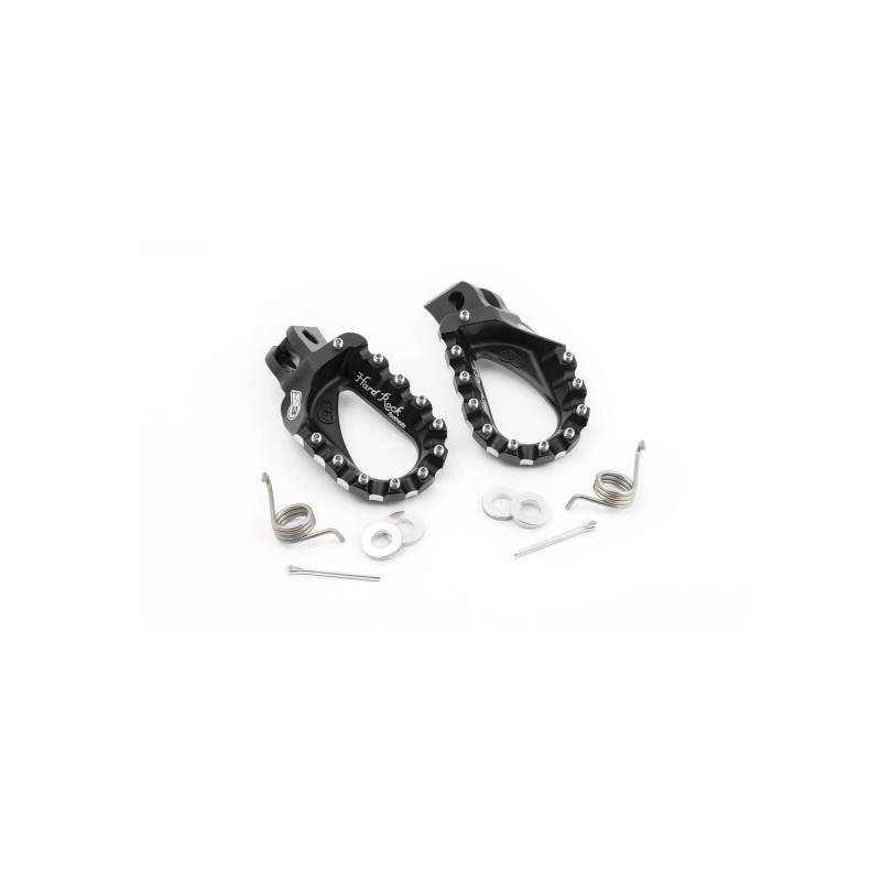 MODELO DE ALUMINIO "HARD ROCK" Minimalista y ligero Fabricado en aluminio 7075 Ergal Distintos colores Mayor anchura, para una mayor estabilidad y equilibrio encima de la moto Su diseño en forma de "U" evita bloqueos en las roderas Su diseño mantiene los estribos limpios de barro LLeva "dientes" inetrcambiables de acero inoxidable Aporta un extra de calidad a tu moto.